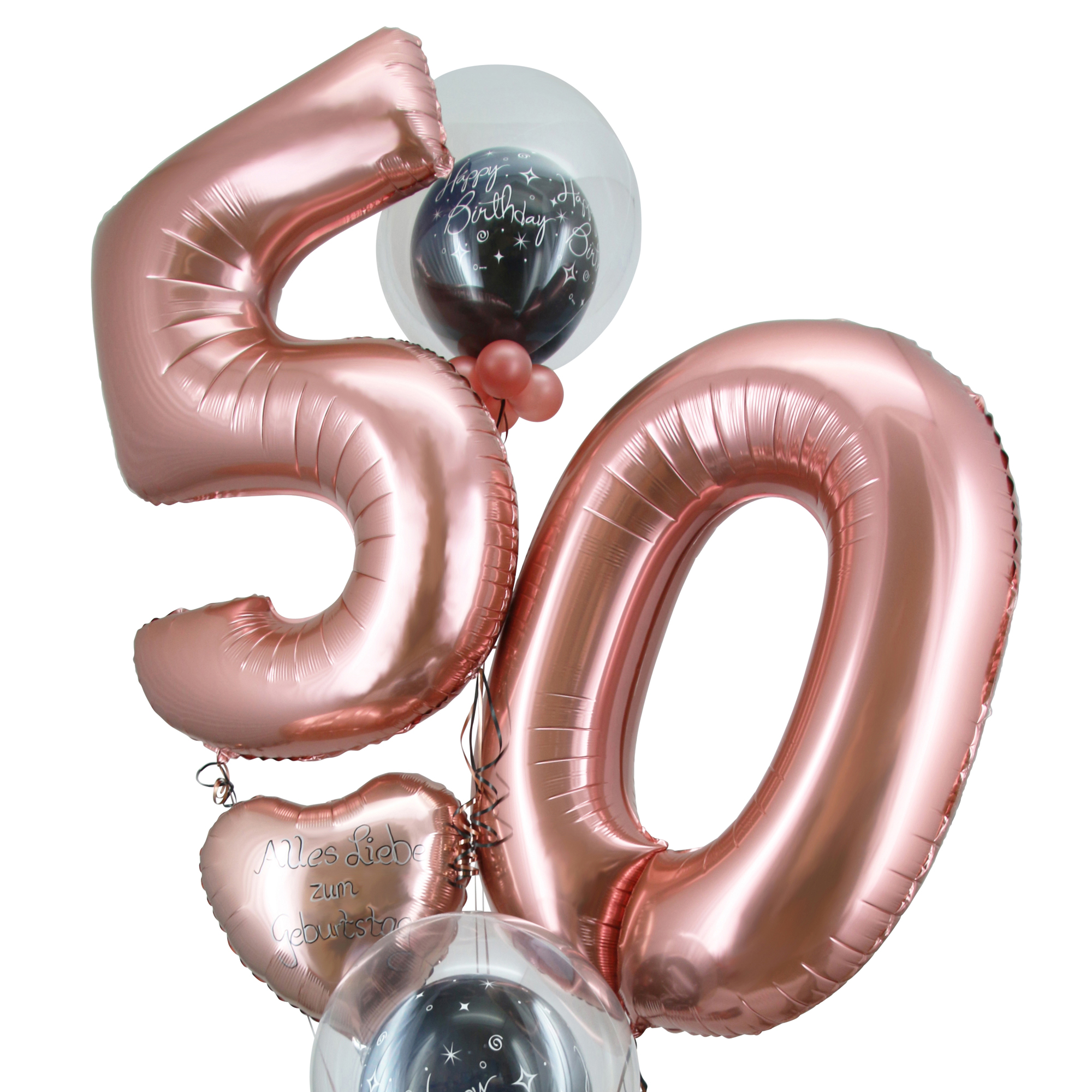 Großes, edel wirkendes Zahlenbouquet zum 50. Geburtstag in rosegold. Die zwei großen Zahlen in rosegold werden von zwei 24″ großen Bubbles (Ballon in Ballon), welche mit schwarzen Latexballons gefüllt sind und einen weißen „Happy-Birthday“ Aufdruck haben, begleitet. Dazu gesellt sich ein beschriftetes Folienherz in rosegold und macht aus dem Bouquet einen toll aussehendes Highlight. Der Standfuß und die Dekoration mit Bändern und kleinen Ballons ist in rosegold und schwarz gestaltet.